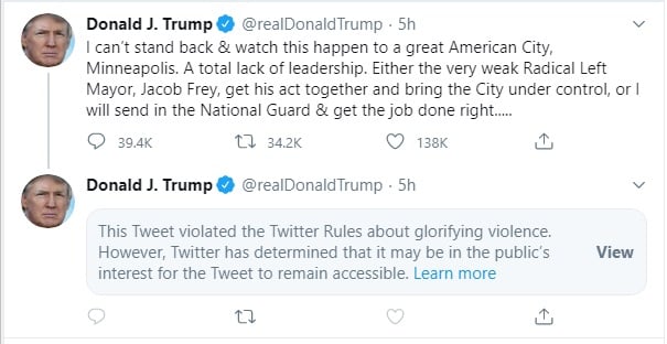 ทวิตเตอร์ ได้แจ้งเตือนข้อความหนึ่งบนทวิตเตอร์ของนายโดนัลด์ ทรัมป์ ประธานาธิบดีสหรัฐ โดยได้ขึ้นแถบข้อความเตือนทวีตดังกล่าวว่าเข้าข่ายสนับสนุนความรุนแรง