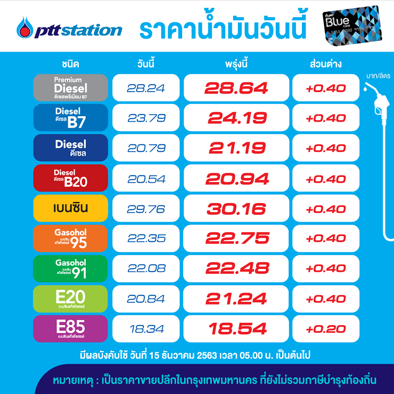 บมจ.ปตท.น้ำมันและการค้าปลีก (OR) และบมจ.บางจาก คอร์ปอเรชั่น (BCP) ปรับขึ้นราคาขายปลีกน้ำมันทุกชนิด 40 สตางค์/ลิตร เว้น E85 ปรับขึ้น 20 สตางค์/ลิตร มีผลตั้งแต่วันที่ 15 ธ.ค.63 เวลา 05.00 น. เป็นต้นไป