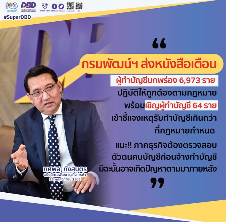 นายทศพล ทังสุบุตร อธิบดีกรมพัฒนาธุรกิจการค้า กระทรวงพาณิชย์ เปิดเผยว่า ปัจจุบันประเทศไทยมีผู้ทำบัญชีรวมทั้งสิ้น 78,858 ราย จำนวนนี้มีชื่อเป็นผู้ทำบัญชีในการนำส่งงบการเงินของธุรกิจรวมทั้งสิ้น 52,134 ราย จากการตรวจสอบข้อมูลเชิงลึกพบว่า มีผู้ทำบัญชีที่บกพร่องในการปฏิบัติตามเงื่อนไขของการเป็นผู้ทำบัญชี ทั้งเรื่องการแจ้งรายชื่อธุรกิจที่รับทำบัญชีไม่ครบถ้วน หรือ แจ้งรายชื่อธุรกิจที่รับทำบัญชีเกินกว่า 30 วันนับจากวันที่รับจ้างทำบัญชีจากธุรกิจ จำนวน 6,973 ราย
