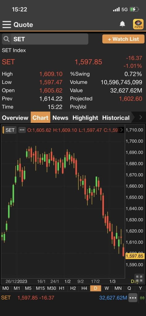 - เมื่อเวลา 15.22 น.ดัชนี SET มาอยู่ที่ 1,597.85 จุด ลดลง 16.37 จุด (-1.01%)
