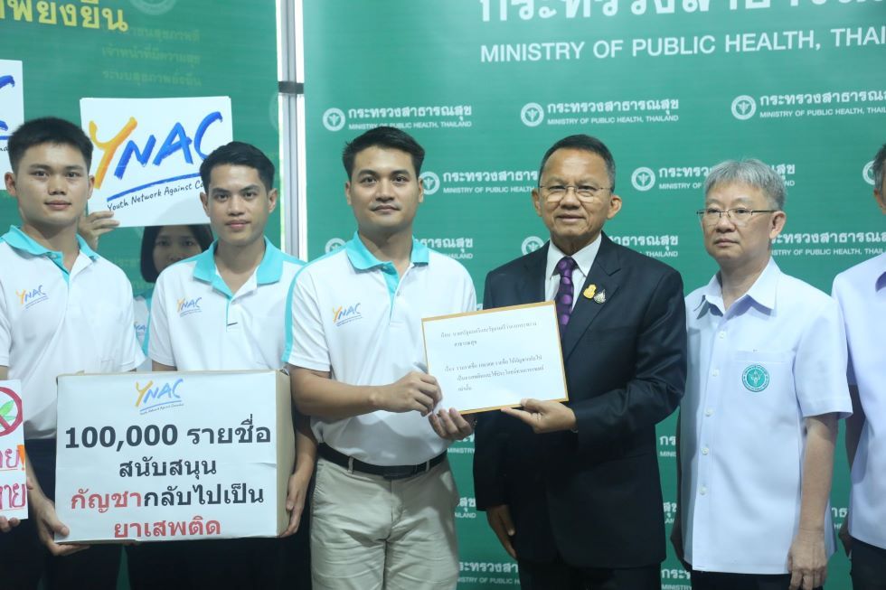 นายสมศักดิ์ เทพสุทิน รมว.สาธารณสุข รับหนังสือจากกลุ่ม YNAC (Youth Network Against Cannabis) ที่ได้มีการรวบรวมรายชื่อผู้ที่สนับสนุนให้นำกัญชากลับไปเป็นยาเสพติด และใช้ประโยชน์ทางการแพทย์เท่านั้น