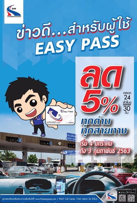 นายสุชาติ ชลศักดิ์พิพัฒน์ ผู้ว่าการ การทางพิเศษแห่งประเทศไทย (กทพ.) เปิดเผยว่า กทพ.ให้ส่วนลดค่าผ่านทางพิเศษสำหรับผู้ใช้บัตร Easy Pass 5% ซึ่งหากมีเศษสตางค์จะปัดเศษทิ้งเพื่อประโยชน์แก่ผู้ใช้บัตรฯ โดยจะให้ส่วนลดทุกด่านฯ จำนวน 122 ด่าน ทุกสายทางพิเศษ ตลอด 24 ชั่วโมง เป็นระยะเวลา 30 วัน ตั้งแต่วันที่ 4 มกราคม 2563 เวลา 00.01 น. จนถึงวันที่ 3 กุมภาพันธ์ 2563 เวลา 24.00 น.
