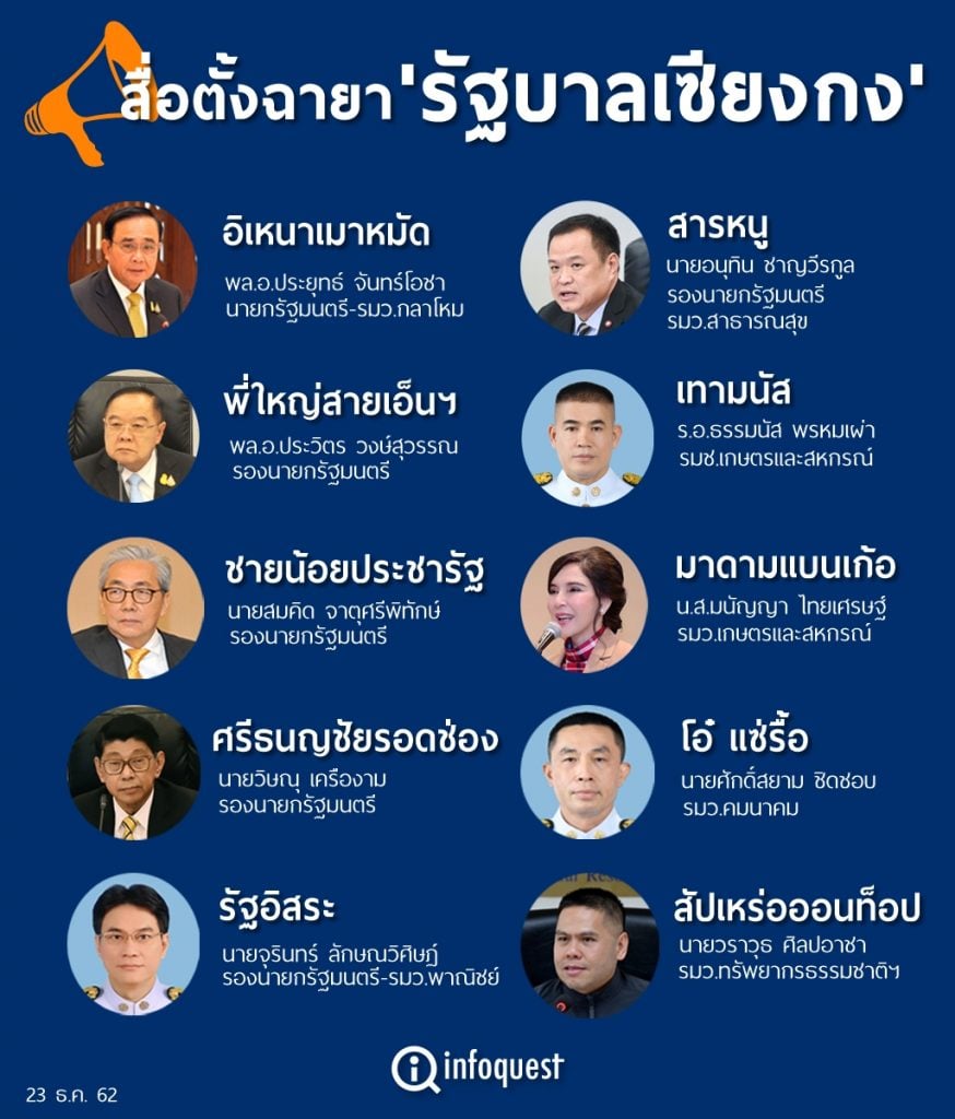 รายงานข่าวจากทำเนียบรัฐบาล เปิดเผยว่า ผู้สื่อข่าวประจำทำเนียบรัฐบาล ได้ตั้งฉายารัฐบาลและรัฐมนตรีในสมัยพล.อ.ประยุทธ์ จันทร์โอชา เป็นนายกรัฐมนตรี ในปี 2562 ตามธรรมเนียมปฏิบัติ หลังว่างเว้นมา 6 ปี