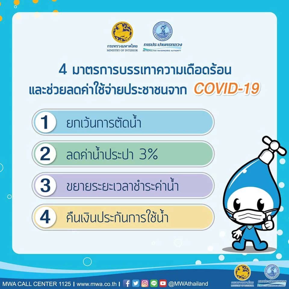 - ยกเว้นการตัดน้ำ ทั้งมาตรชั่วคราวและถาวร งดการผูกลวดและการถอดมิเตอร์น้ำ 2 เดือน ตั้งแต่บัดนี้ถึงวันที่ 31 พฤษภาคม 2563