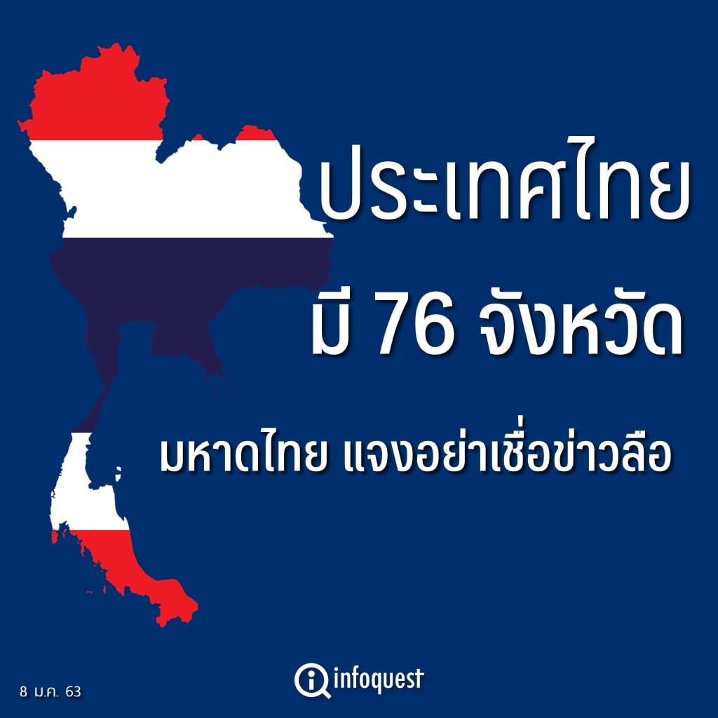 รายงานข่าวจากกรมการปกครอง กระทรวงมหาดไทย แจ้งว่า ตามที่ปรากฎข่าวสารผ่านสื่อออนไลน์ว่า “ประกาศชาวไทย จะมี 83 จังหวัดแล้ว” นั้น กรมการปกครอง กระทรวงมหาดไทย ขอชี้แจงให้ทราบว่า ข้อมูลข่าวดังกล่าวไม่เป็นความจริงแต่ประการใด และเป็นการแชร์ข่าวที่เคยเป็นข่าวปลอมมาตั้งแต่ปี พ.ศ.2558 ทั้งนี้ ขอเรียนให้ทราบว่าปัจจุบันประเทศไทย มีจำนวนทั้งสิ้น 76 จังหวัด