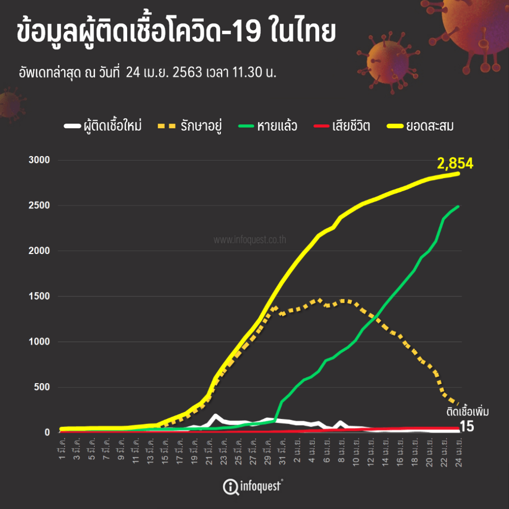 - ผู้ติดเชื้อไวรัสโควิด-19 ยอดสะสม 2,854 คน (+15)