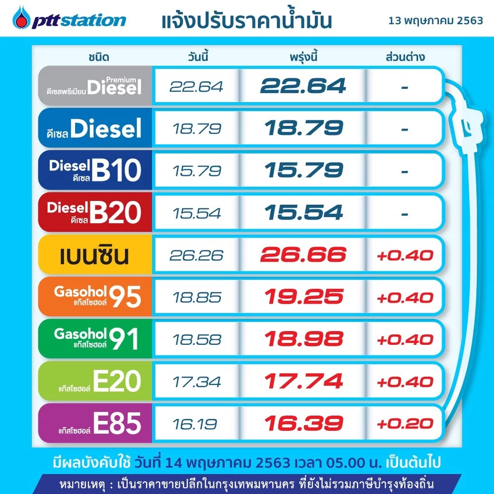 ส่วนราคาน้ำมันดีเซลคงเดิม โดยน้ำมันดีเซล B7 อยู่ที่ลิตรละ 18.79 บาท, B10 ลิตรละ 15.79 บาท และ B20 ลิตรละ 15.54 บาท (ราคาขายปลีกข้างต้นยังไม่รวมภาษีบำรุงท้องถิ่น)