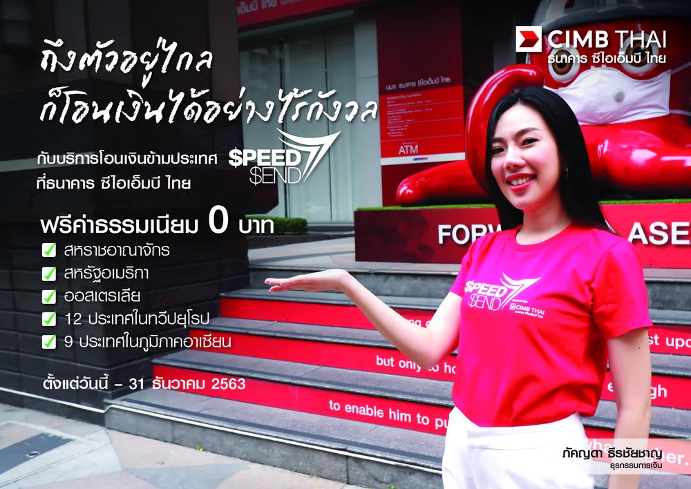 ธนาคาร ซีไอเอ็มบี ไทย (CIMBT) ออกโปรโมชั่นพิเศษ ฟรีค่าธรรมเนียม 0 บาท กับบริการโอนเงินข้ามประเทศ Speedsend เมื่อลูกค้าโอนเงินไปยังสหราชอาณาจักร สหรัฐอเมริกา ออสเตรเลีย และในทวีปยุโรปจำนวน 12 ประเทศ
