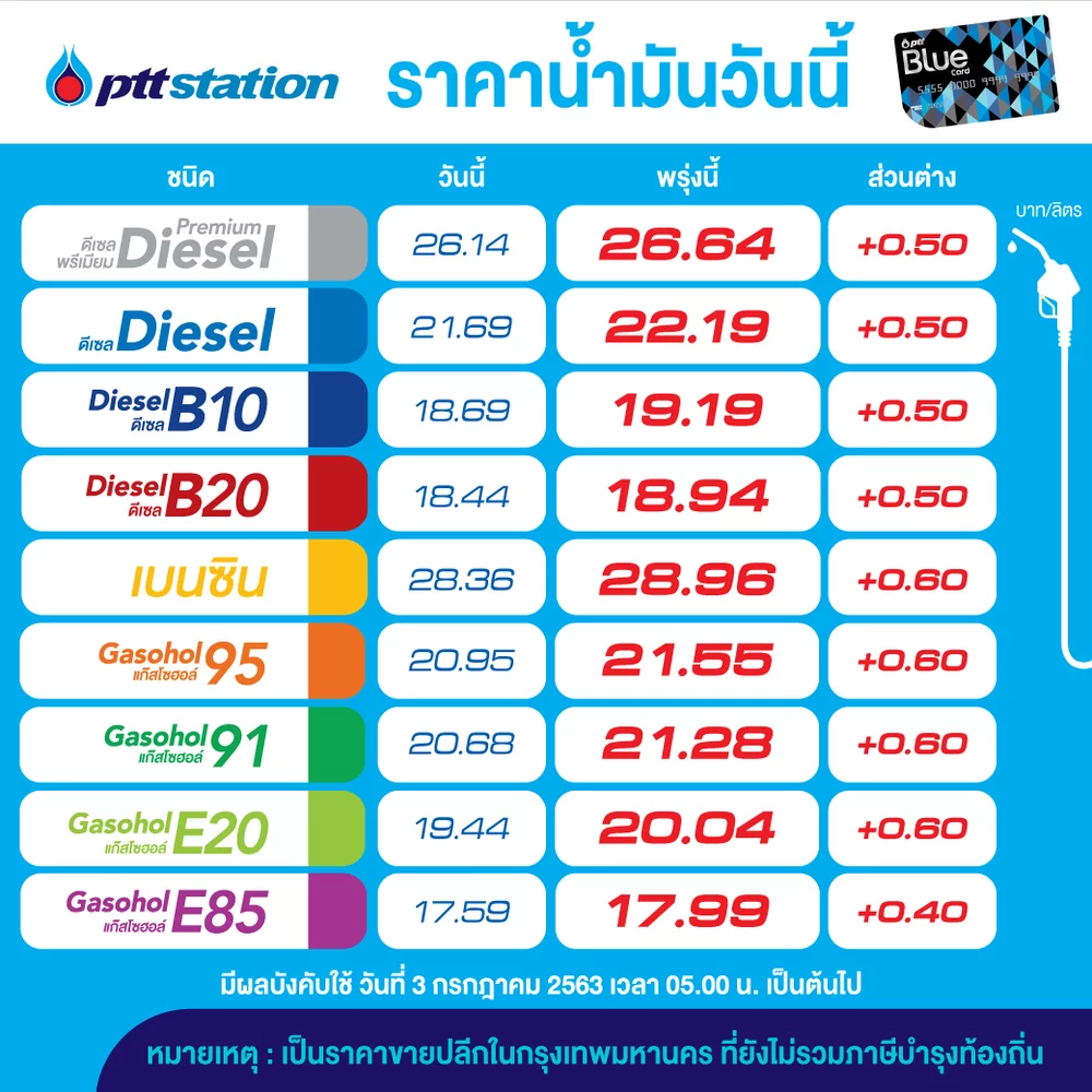 ทั้งนี้ ส่งผลให้ราคาน้ำมันในพื้นที่กรุงเทพฯ และปริมณฑลวันพรุ่งนี้ เป็นดังนี้ กลุ่มเบนซิน เบนซิน 95 ของ PTT Station อยู่ที่ลิตรละ 28.96 บาท, แก๊สโซฮอล์ 95 ลิตรละ 21.55 บาท, แก๊สโซฮอล์ 91 ลิตรละ 21.28 บาท, E20 ลิตรละ 20.04 บาท, E85 ลิตรละ 17.99 บาท
