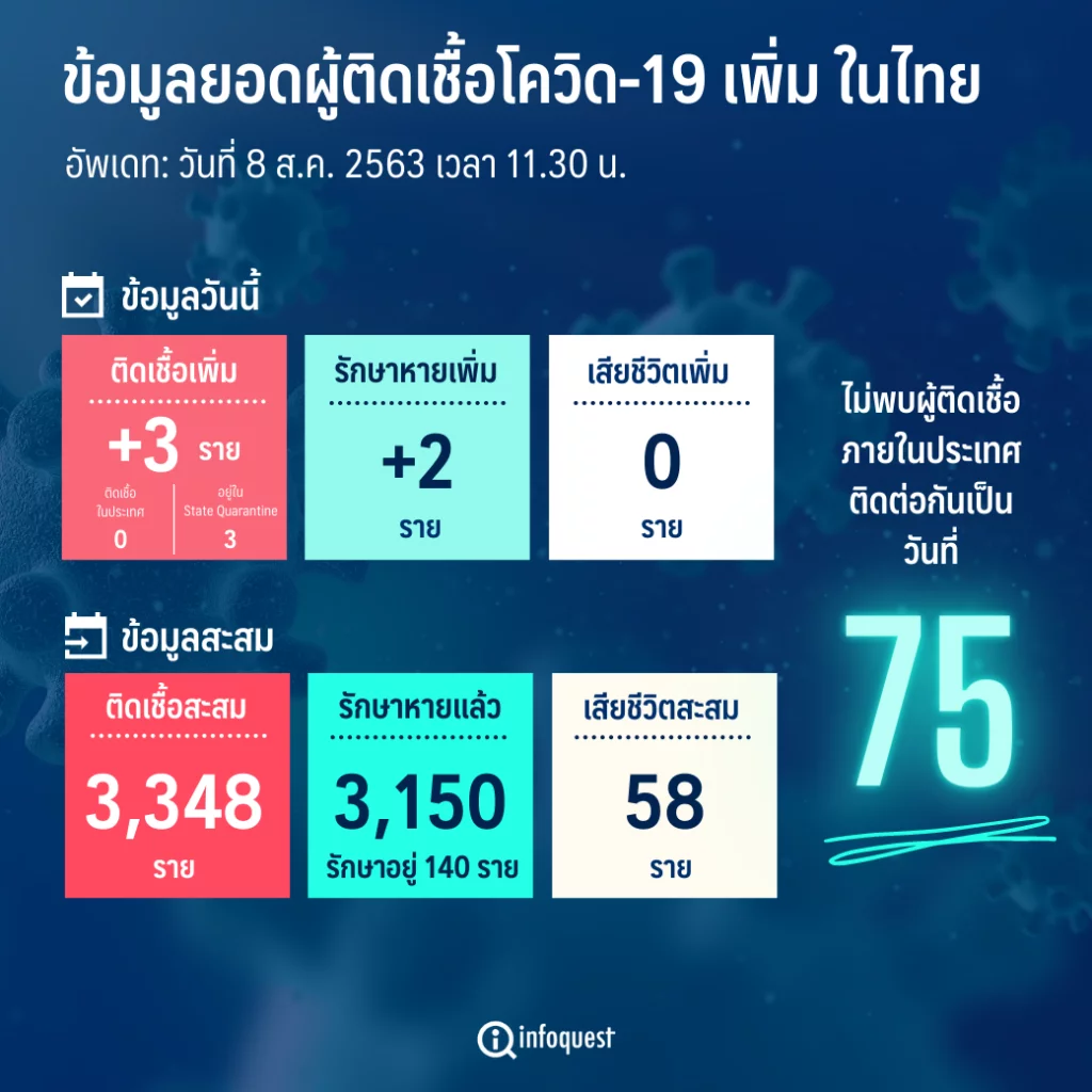 ผู้ติดเชื้อรายใหม่วันนี้ เป็นนักศึกษาชายไทย 2 ราย อายุ 24 ปี เดินทางมาจากประเทศซาอุดิอาระเบีย ถึงไทยวันที่ 25 ก.ค. (เที่ยวบินเดียวกับผู้ป่วยยืนยันก่อนหน้า 12 ราย) เข้าพักใน State Quarantine ที่ จ.ชลบุรี และตรวจหาเชื้อวันที่ 7 ส.ค. ผลตรวจพบเชื้อ ทั้งหมดไม่มีอาการ ส่วนอีก 1 ราย เป็นชายไทยอายุ 32 ปี อาชีพพนักงานบริษัทรับเหมาก่อสร้าง เดินทางมาจากประเทศอินโดนีเซีย ถึงไทยเมื่อวันที่ 3 ส.ค. เข้าพักใน State Quarantine ที่ จ.สมุทรปราการ และตรวจหาเชื้อในวันที่ 6 ส.ค. ผลตรวจพบเชื้อ แต่ไม่มีอาการ