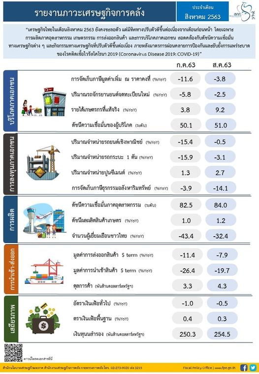 สำหรับภาพรวมเศรษฐกิจไทยในเดือน ส.ค. 63 ยังคงชะลอตัว แต่มีทิศทางปรับตัวดีขึ้นต่อเนื่องจากเดือนก่อนหน้า โดยเฉพาะการผลิตภาคอุตสาหกรรม เกษตรกรรม การส่งออกสินค้า และการบริโภคภาคเอกชน สอดคล้องกับดัชนีความเชื่อมั่นทางเศรษฐกิจต่าง ๆ และกิจกรรมทางเศรษฐกิจที่ปรับตัวดีขึ้นต่อเนื่อง ภายหลังมาตรการผ่อนคลายการป้องกันและยับยั้งการแพร่ระบาดของโรคติดเชื้อไวรัสโควิด-19