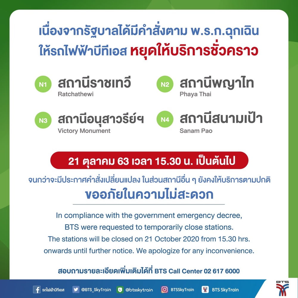 รายงานข่าวจาก บมจ.ระบบขนส่งมวลชนกรุงเทพ ผู้ให้บริการรถไฟฟ้าบีทีเอส เปิดเผยว่า บีทีเอสได้รับคำสั่งจากกองอำนวยการร่วมแก้ไขสถานการณ์ฉุกเฉินที่มีความร้ายแรง (กอร.ฉ.) ให้ปิดการบริการสถานีรถไฟฟ้าบีทีเอส สายสุขุมวิท ได้แก่ สถานีสนามเป้า สนานีอนุสาวรีย์ชัยสมรภูมิ สถานีพญาไท และสถานีราชเทวี และสถานีรถไฟฟ้าแอร์พอร์ต เรล ลิงค์ สถานีพญาไท