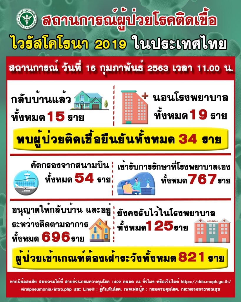สถานการณ์ถึงวันที่ 16 กุมภาพันธ์ 2563 ณ เวลา 08.00 น. ผู้ป่วยยืนยันติดเชื้อรักษาในโรงพยาบาล 19 ราย กลับบ้านแล้ว 15 ราย รวมสะสม 34 ราย ผู้ปวยเข้าเกณฑ์สอบสวนโรคต้องเฝ้าระวัง ตั้งแต่วันที่ 3 มกราคม – 1ธกุมภาพันธ์ 2563 มีผู้ป่วยเข้าเกณฑ์สอบสวนต้องเฝ้าระวังสะสมทั้งหมด 821 ราย คัดกรองจากสนามบิน 54 ราย มารับการรักษาที่โรงพยาบาลเอง 767 ราย อนุญาตให้กลับบ้านได้แล้วและอยู่ระหว่างติดตามอาการ 696 ราย ส่วนใหญ่เป็นไข้หวัดใหญ่ตามฤดูกาล ยังคงรักษาในโรงพยาบาล 125 ราย