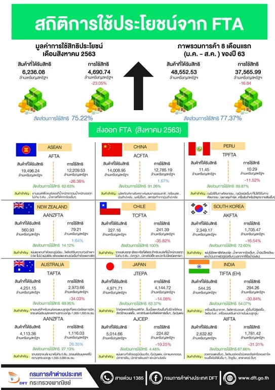 สำหรับการใช้สิทธิประโยชน์ภายใต้ความตกลงทางการค้าเสรี (FTA) ในช่วง 8 เดือนแรกของปี 2563 มีมูลค่า 37,565.99 ล้านเหรียญสหรัฐฯ ลดลงเมื่อเทียบกับช่วงเวลาเดียวกันของปีที่ผ่านมา 16.84% มีสัดส่วนการใช้สิทธิฯ 77.37% โดยตลาดที่ไทยส่งออกโดยมีมูลค่าการใช้สิทธิฯ ภายใต้ FTA สูงสุด 5 อันดับแรก ได้แก่ 1) จีน (มูลค่า 12,785.19 ล้านเหรียญสหรัฐฯ) 2) อาเซียน (มูลค่า 12,209.53 ล้านเหรียญสหรัฐฯ) 3) ญี่ปุ่น (มูลค่า 4,369.54 ล้านเหรียญสหรัฐฯ) 4) ออสเตรเลีย (มูลค่า 4,089.69 ล้านเหรียญสหรัฐฯ) และ 5) อินเดีย (มูลค่า 2,075.68 ล้านเหรียญสหรัฐฯ)