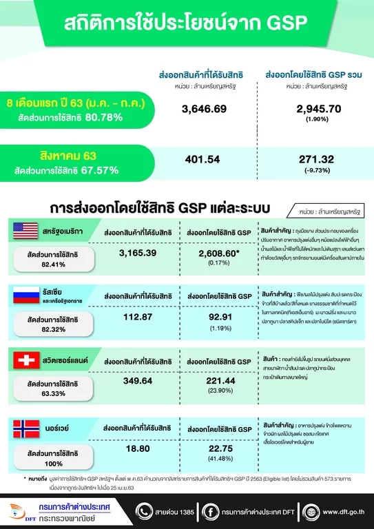 นายกีรติ รัชโน อธิบดีกรมการค้าต่างประเทศ กระทรวงพาณิชย์ เปิดเผยถึงการใช้สิทธิประโยชน์สำหรับการส่งออกภายใต้ความตกลงการค้าเสรี (FTA) และภายใต้ระบบสิทธิพิเศษทางภาษีศุลกากรเป็นการทั่วไป (GSP) ระหว่างเดือนม.ค.-ส.ค.63 ว่า มีมูลค่าการใช้สิทธิฯ รวมเท่ากับ 40,511.69 ล้านเหรียญสหรัฐฯ มีสัดส่วนการใช้สิทธิฯ 77.61%