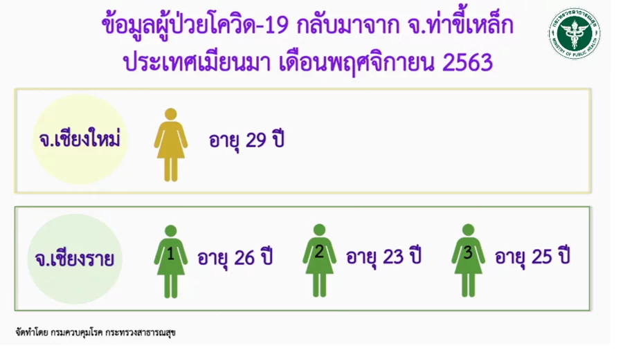 นพ.โสภณ เอี่ยมศิริถาวร ผู้อำนวยการกองโรคติดต่อทั่วไป กรมควบคุมโรค แถลงพบผู้ป่วยติดเชื้อโควิดรายใหม่อีก 1 ราย ในจ.เชียงราย เป็นหญิงไทย อายุ 25 ปี ภูมิลำเนา จ.พะเยา ซึ่งทำงานในสถานบันเทิงในเมียนมาแห่งเดียวกับหญิงไทยที่จ.เชียงใหม่ และในจ.เชียงรายที่พบการติดเชื้อก่อนหน้านี้ โดยเดินทางจากเมียนมามาตามช่องทางธรรมชาติ เมื่อวันที่ 24 พ.ย.พร้อมเพื่อนอีก 2 คนมาที่ อ.แม่สาย
