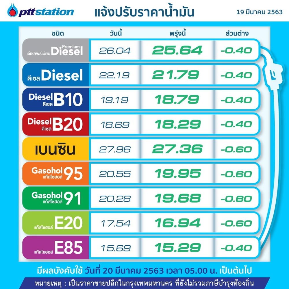 บมจ.ปตท.น้ำมันและการค้าปลีก (OR) ในกลุ่ม บมจ.ปตท. (PTT) และ บมจ.บางจาก คอร์ปอเรชั่น (BCP) ปรับลดราคาขายปลีกน้ำมันกลุ่มเบนซิน รวมถึงแก๊สโซฮอล์ ลิตรละ 0.60 บาท ยกเว้น E85 และดีเซล ปรับลดลง ลิตรละ 0.40 บาท โดยมีผลตั้งแต่เวลา 05.00 น. วันพรุ่งนี้ (20 มี.ค.)