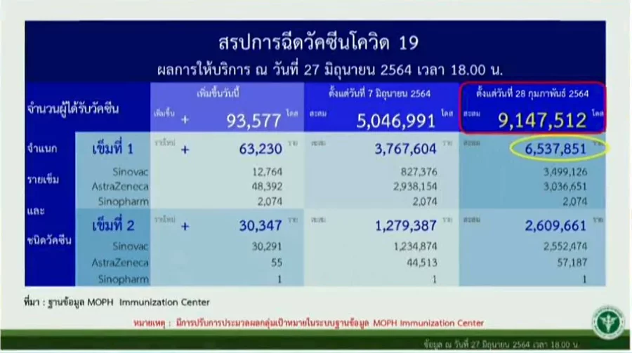 ศูนย์บริหารสถานการณ์โควิด-19 (ศบค.) รายงานยอดการฉีดวัคซีนโควิด-19 ให้แก่ประชาชนในวันที่ 27 มิ.ย.64 มีจำนวนผู้ได้รับวัคซีน 93,577 โดส รายละเอียดดังนี้