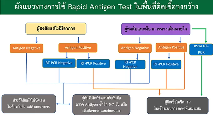 - ผู้สงสัยแต่ไม่มีอาการให้ตรวจคัดกรองด้วยชุดตรวจ Rapid Antigen Test