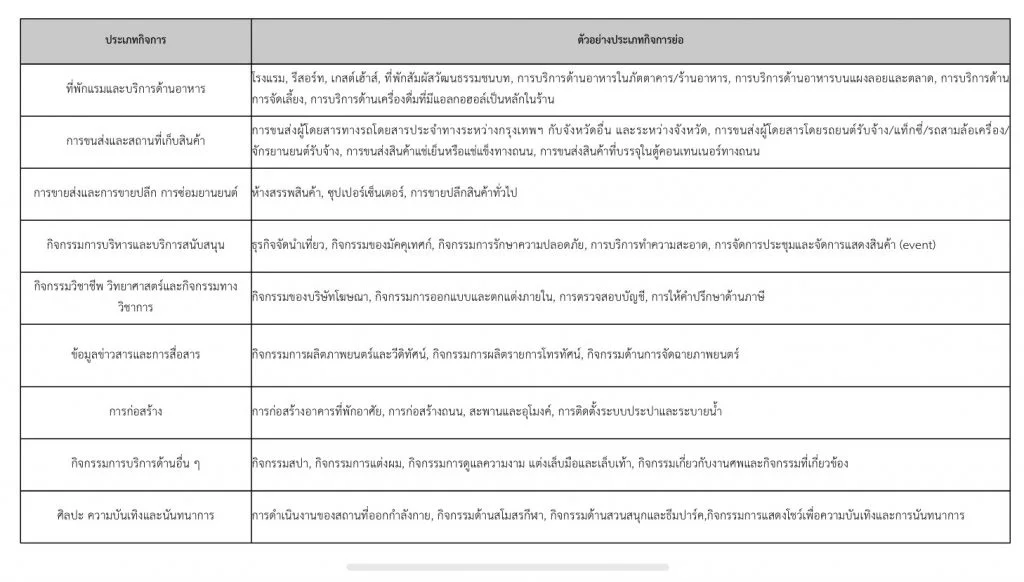 2. เพิ่มประเภทกิจการรวม 9 สาขา จากเดิม 4 หมวดกิจการ ได้แก่ (1) ก่อสร้าง (2) ที่พักแรมและบริการด้านอาหาร (3) ศิลปะ บันเทิงและนันทนาการ (4) กิจกรรมบริการด้านอื่นๆ ตามที่สำนักงานประกันสังคมกำหนด เพิ่ม 5 หมวดกิจกรรม ได้แก่ (5) ขายส่งและการขายปลีก ซ่อมยานยนต์ (6) ขนส่งและสถานที่เก็บสินค้า (7) กิจกรรมการบริหารและบริการสนับสนุน (8) กิจกรรมวิชาชีพ วิทยาศาสตร์และกิจกรรมทางวิชาการ และ (9) ข้อมูลข่าวสารและการสื่อสาร