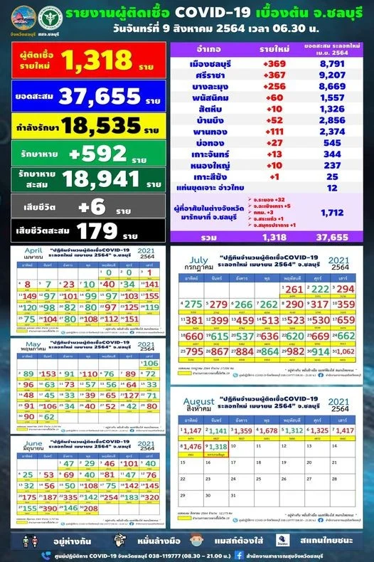 สำนักงานสาธารณสุขจังหวัดชลบุรี รายงานสถานการณ์โควิด-19 ข้อมูล ณ วันที่ 9 ส.ค. 64 เวลา 06.30 น. มีรายงานผู้ติดเชื้อโควิด-19 รายใหม่ จำนวน 1,318 ราย เสียชีวิตเพิ่ม 6 ราย ทำให้มียอดผู้ติดเชื้อสะสมรวม 37,655 ราย รักษาหายแล้วรวม 18,941 ราย ยังคงรักษาตัวอยู่ในโรงพยาบาลอีก 18,535 ราย และมีผู้เสียชีวิตสะสม 179 ราย