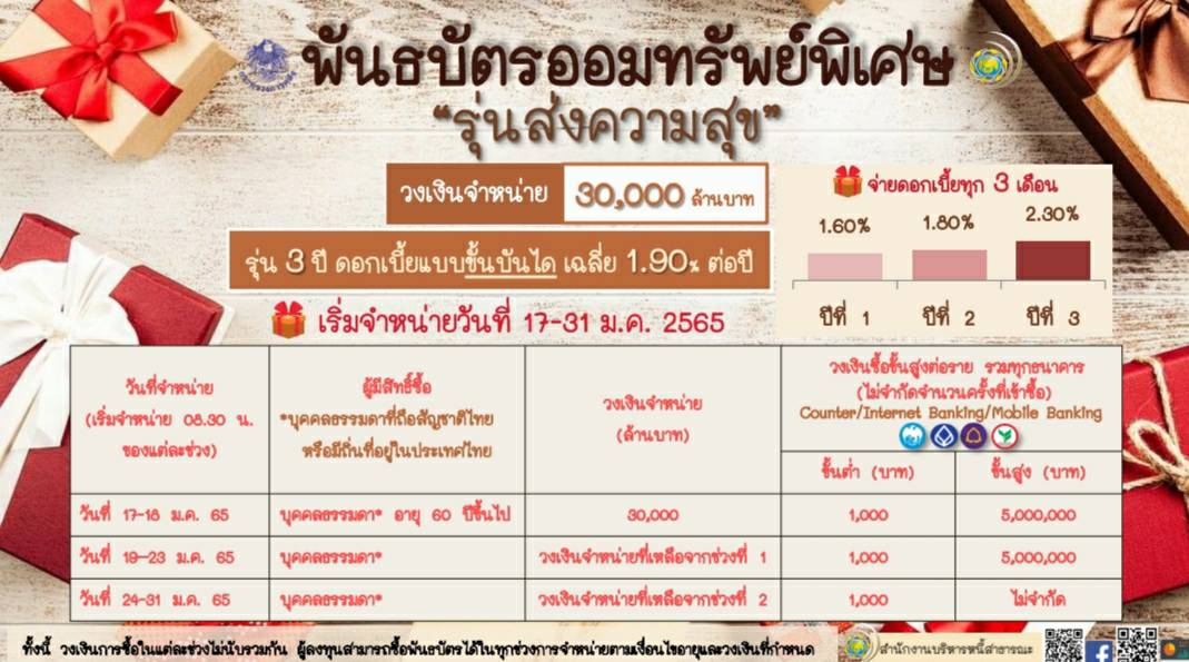 สำหรับการจำหน่ายพันธบัตรออมทรัพย์พิเศษ รุ่นส่งความสุข เริ่มจำหน่ายวันที่ 17-31 ม.ค. 65 เวลา 8.30 น. รุ่นอายุ 3 ปี อัตราดอกเบี้ยแบบขั้นบันไดเฉลี่ย 1.90% ต่อปี (ปีที่ 1 อัตราดอกเบี้ย 1.60% ต่อปี ปีที่ 2 อัตราดอกเบี้ย 1.80% ต่อปี ปีที่ 3 อัตราดอกเบี้ย 2.30% ต่อปี) ลงทุนได้ตั้งแต่ 1,000 บาท แบ่งการจำหน่ายเป็น 3 ช่วง โดยในสัปดาห์แรกจะเป็นการจำหน่ายแบบกำหนดอายุและจำกัดวงเงิน และในสัปดาห์ถัดไปจึงเปิดโอกาสให้ซื้อแบบไม่จำกัดวงเงิน ดังนี้