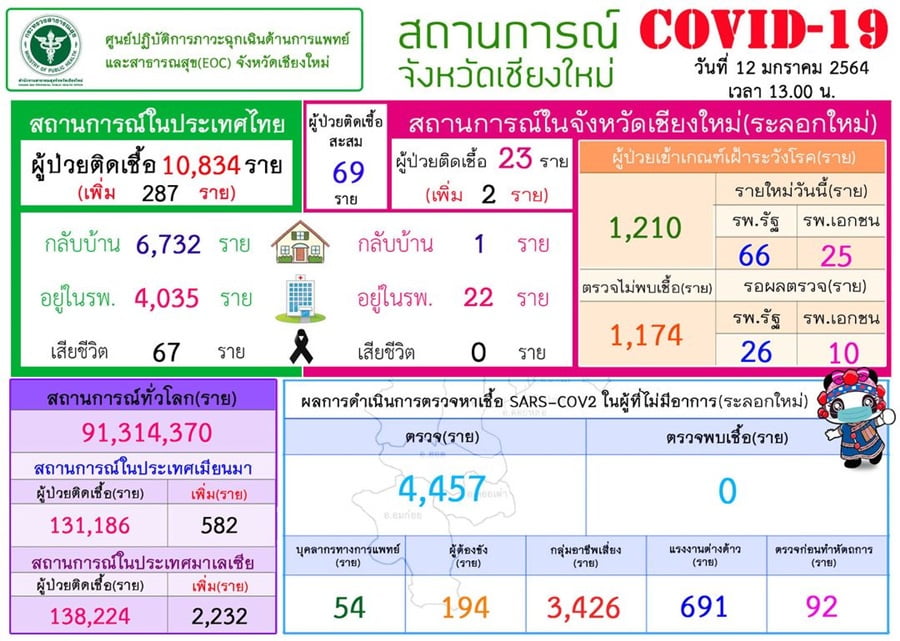 • ผู้ป่วยโควิด-19 รายที่ 68 ของจังหวัดเชียงใหม่ หญิงไทย อายุ 50 ปี แม่บ้าน ภูมิลำเนา อ.เมือง จ.เชียงใหม่ รับรักษาตัวห้องแยกความดันลบโรงพยาบาลนครพิงค์ เบื้องต้น ผู้ป่วยให้ข้อมูลว่า เริ่มมีอาการป่วยเล็กน้อยตั้งแต่วันที่ 1 ม.ค. 2564 แต่ไม่มีประวัติเสี่ยงสัมผัส จึงไม่ได้ไปตรวจหาเชื้อโควิด-19 และชีวิตประจำวันส่วนใหญ่ตั้งแต่เริ่มป่วยพักรักษาตัวที่บ้านพักของตนเอง
