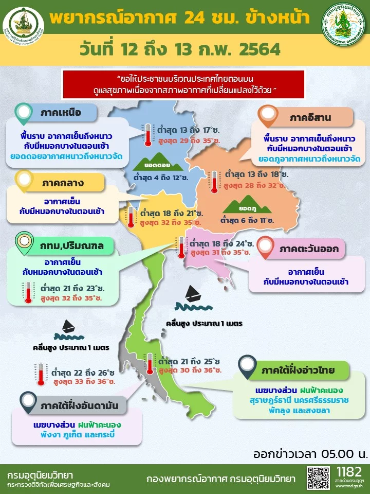 กรมอุตุนิยมวิทยา พยากรณ์อากาศ 24 ชั่วโมงข้างหน้า บริเวณความกดอากาศสูงหรือมวลอากาศเย็นกำลังปานกลางยังคงปกคลุมบริเวณประเทศไทยตอนบน ทำให้บริเวณดังกล่าวยังคงมีอากาศหนาวเย็นและมีหมอกบางในตอนเช้า ขอให้ประชาชนบริเวณประเทศไทยตอนบนดูแลสุขภาพเนื่องจากสภาพอากาศที่เปลี่ยนแปลงไว้ด้วย