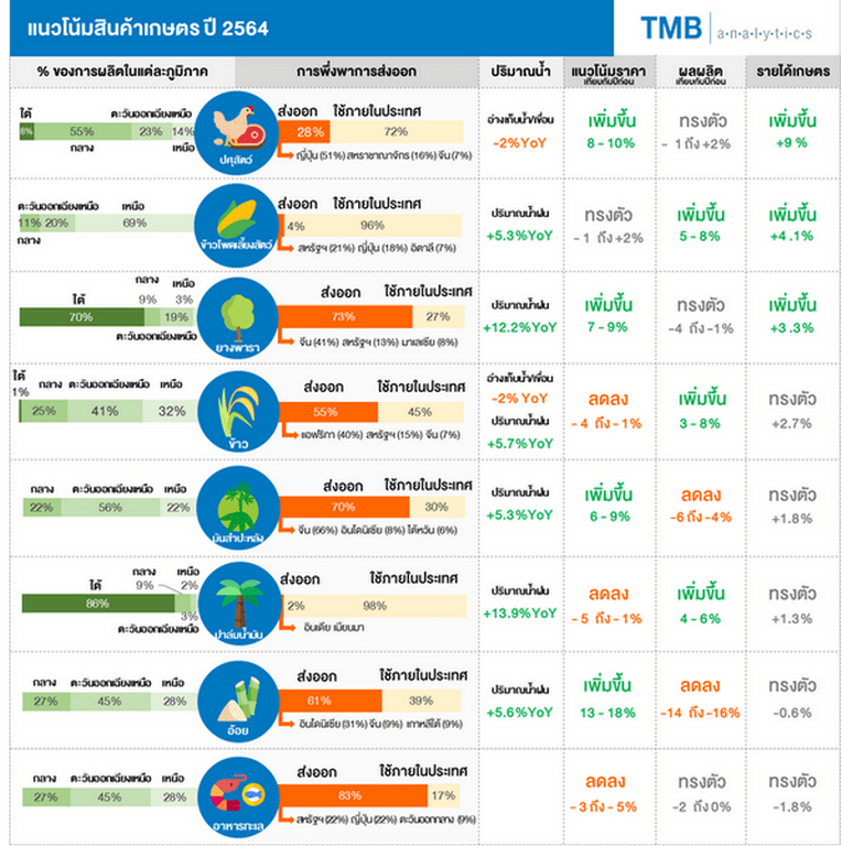 ศูนย์วิเคราะห์เศรษฐกิจ ทีเอ็มบี ระบุว่า จากแนวโน้มสินค้าเกษตรที่ประเมินไว้ เนื่องจากโครงสร้างตลาดสินค้าเกษตรไทยส่วนใหญ่ยังพึ่งพาตลาดส่งออกซึ่งมีการแข่งขันสูง และค่าเงินบาทที่มีแนวโน้มแข็งค่าขึ้นในปี 2564 จึงเป็นปัจจัยเสี่ยงสำคัญที่ลดทอนความสามารถในการแข่งขันของสินค้าเกษตรไทย อย่างไรก็ตาม หากสามารถควบคุมระดับอุปทานให้มีปริมาณที่เหมาะสมและต้นทุนที่มีประสิทธิภาพ รวมไปถึงนโยบายสนับสนุนที่ช่วยประกันความเสี่ยงด้านราคาจากภาครัฐ จะช่วยให้สินค้าเกษตรและผลิตภัณฑ์เกษตรแปรรูปเป็นส่วนสำคัญในการช่วยหล่อเลี้ยงเกษตรกรและเศรษฐกิจภายในประเทศได้