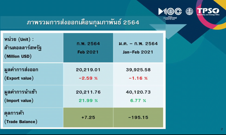 สำนักงานนโยบายและยุทธศาสตร์การค้า (สนค.) กระทรวงพาณิชย์ ระบุว่า ภาพรวมการส่งออกไทยเดือน ก.พ. 64 มีมูลค่า 20,219.01 ล้านเหรียญสหรัฐ กลับมาหดตัว 2.59% จากเดือน ม.ค.64 ที่ขยายตัว 0.35% ขณะที่ตลาดคาดว่าจะติดลบราว 1.5-2.4% ทั้งนี้ เมื่อหักสินค้าเกี่ยวเนื่องกับน้ำมัน ทองคำ และอาวุธยุทธปัจจัย การส่งออกจะขยายตัว 2.87% สะท้อนการเติบโตของภาคเศรษฐกิจจริง