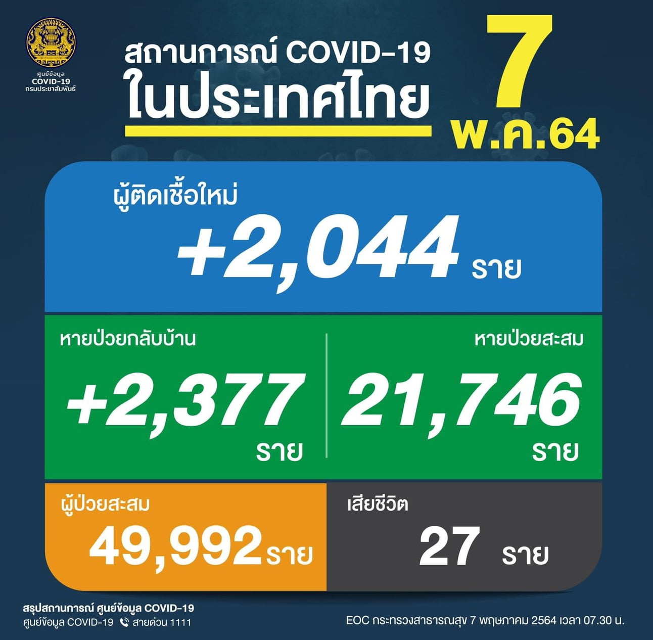 ศูนย์บริหารสถานการณ์โควิด-19 (ศบค.) รายงานสถานการณ์การแพร่ระบาดของไวรัสโควิด-19 ในประเทศวันนี้ พบผู้ติดเชื้อรายใหม่ 2,044 ราย และมีผู้เสียชีวิต 27 ราย ทำให้มีจำนวนผู้ป่วยยืนยันสะสมในประเทศระลอกใหม่เดือน เม.ย.อยู่ที่ 49,992 ราย ส่วนยอดเสียชีวิตสะสมเพิ่มเป็น 363 ราย และผู้ป่วยรักษาหายแล้ว 21,746 ราย เพิ่มขึ้น 2,377 ราย