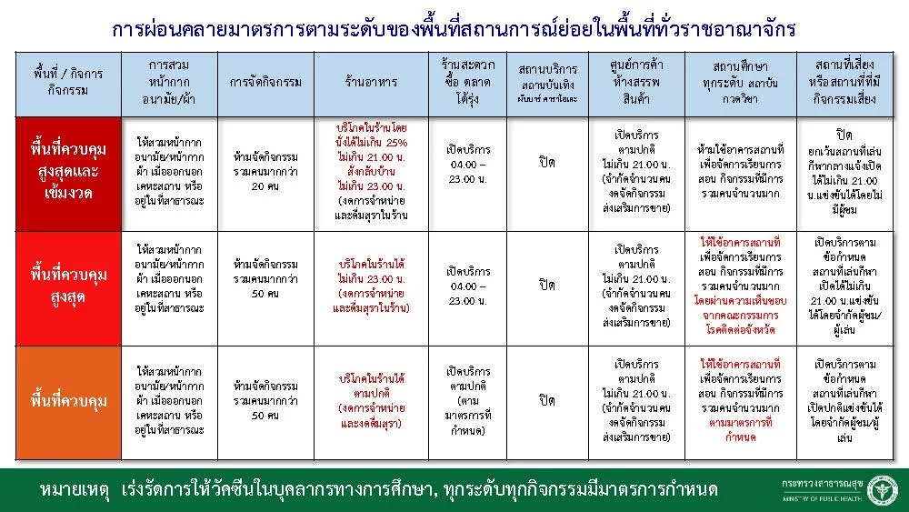 - พื้นที่ควบคุมสูงสุด บริโภคในร้านได้ไม่เกิน 23.00 น. งดการจำหน่ายและดื่มสุราในร้าน, ห้ามจัดกิจกรรมรวมคนมากกว่า 50 คน, ร้านสะดวกซื้อ/ตลาดโต้รุ่ง เปิดบริการ 04.00 – 23.00 น.