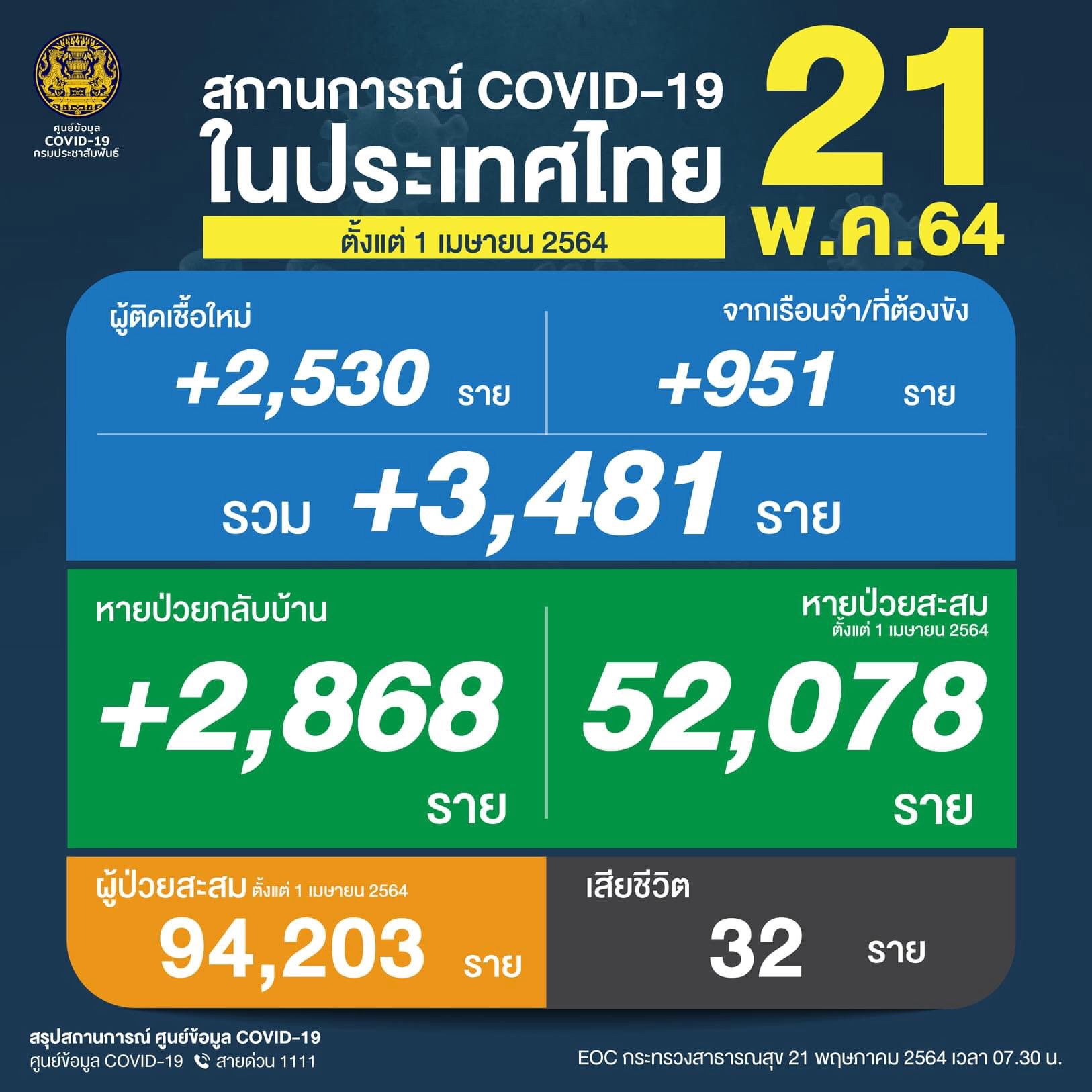 ศูนย์บริหารสถานการณ์โควิด-19 (ศบค.) รายงานสถานการณ์การแพร่ระบาดของไวรัสโควิด-19 ในประเทศวันนี้ พบผู้ติดเชื้อรายใหม่รวม 3,481 ราย แบ่งเป็นผู้ติดเชื้อใหม่ 2,530 ราย และจากเรือนจำ 951 ราย มีผู้เสียชีวิต 32 ราย และรักษาหายกลับบ้านแล้ว 2,868 ราย ทำให้มีจำนวนผู้ป่วยยืนยันสะสมในประเทศระลอกใหม่อยู่ที่ 94,203 ราย หายป่วยสะสม จำนวน 52,078 ราย