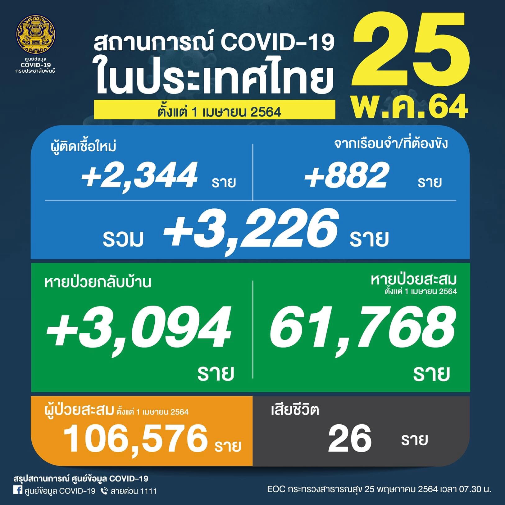 ศูนย์บริหารสถานการณ์โควิด-19 (ศบค.) รายงานสถานการณ์การแพร่ระบาดของไวรัสโควิด-19 ในประเทศวันนี้ พบผู้ติดเชื้อรายใหม่รวม 3,226 ราย แบ่งเป็นผู้ติดเชื้อใหม่ 2,344 ราย และจากเรือนจำ 882 ราย มีผู้เสียชีวิต 26 ราย และรักษาหายกลับบ้านแล้ว 3,094 ราย ทำให้มีจำนวนผู้ป่วยยืนยันสะสมในประเทศระลอกใหม่อยู่ที่ 106,576 ราย หายป่วยสะสม จำนวน 61,768 ราย