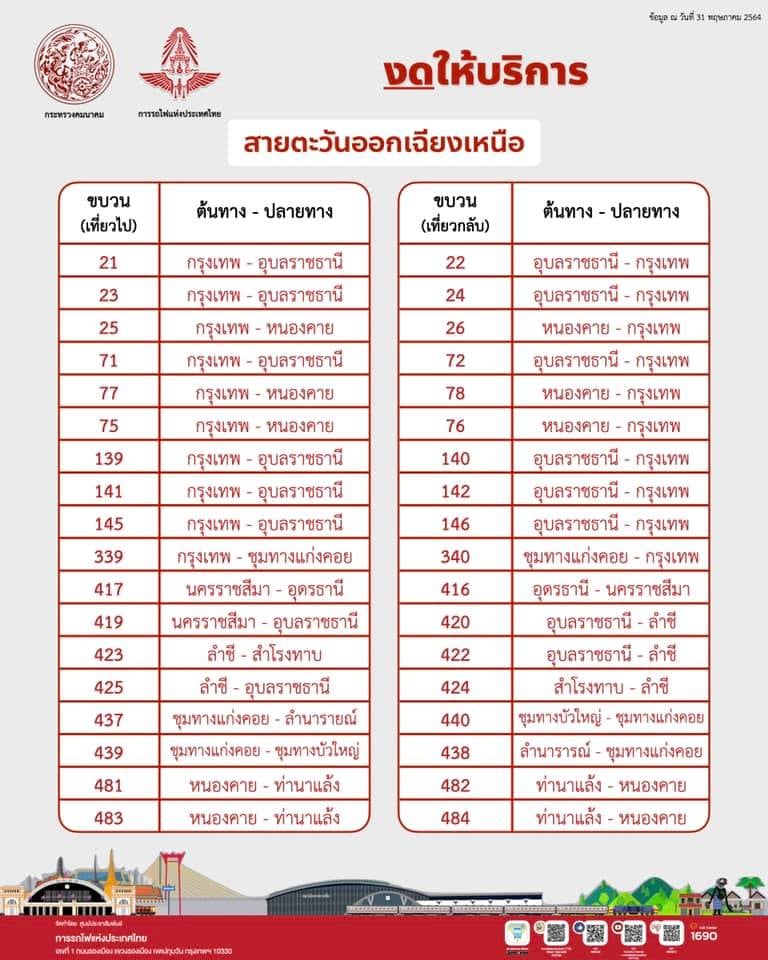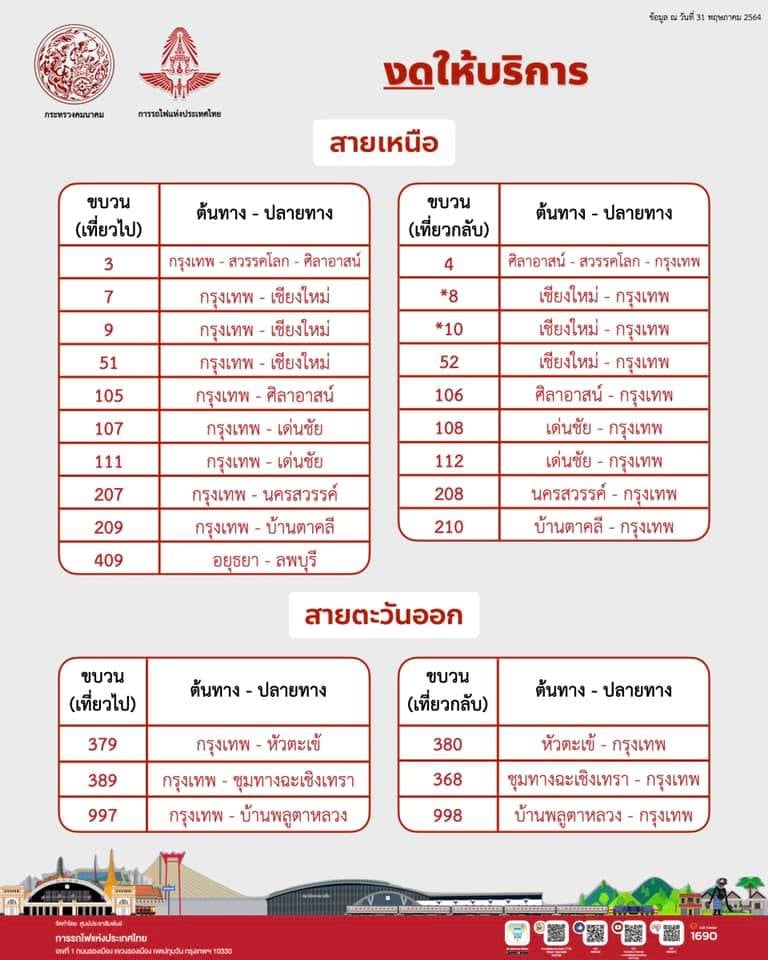 ดังนั้น การรถไฟฯ จึงขอแจ้งปรับแผนให้บริการขบวนรถเส้นทางต่างๆ ให้มีความเหมาะสมต่อสถานการณ์ โดยขยายระยะเวลางดให้บริการขบวนรถเชิงพาณิชย์ (รถทางไกล) ขบวนรถเชิงสังคม(รถระยะสั้น) จำนวน 121 ขบวน ออกไปอีกจนกว่าสถานการณ์จะคลี่คลาย จากเดิมที่จะสิ้นสุดในวันที่ 31 พฤษภาคม 2564