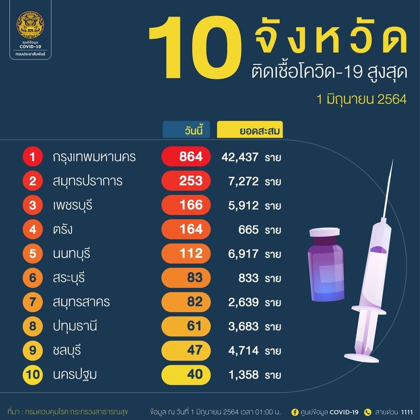 นพ.ทวีศิลป์ วิษณุโยธิน โฆษก ศบค. กล่าวว่า 10 จังหวัดอันดับแรกที่พบผู้ติดเชื้อโควิด-19 สูงสุดระลอกใหม่ ณ วันที่ 1 มิ.ย.64 ได้แก่ กรุงเทพมหานคร 864 ราย สมุทรปราการ 253 ราย เพชรบุรี 166 ราย ตรัง 164 ราย นนทบุรี 112 ราย สระบุรี 83 ราย สมุทรสาคร 82 ราย ปทุมธานี 61 ราย ชลบุรี 47 ราย นครปฐม 40 ราย