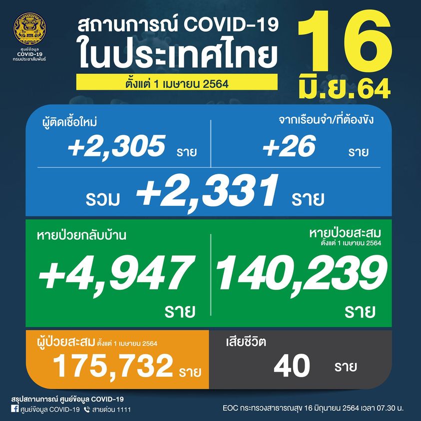 ศูนย์บริหารสถานการณ์โควิด-19 (ศบค.) รายงานสถานการณ์การแพร่ระบาดของไวรัสโควิด-19 ในประเทศวันนี้ พบผู้ติดเชื้อรายใหม่รวม 2,331 ราย แบ่งเป็นผู้ติดเชื้อใหม่ 2,305 ราย และจากเรือนจำ 26 ราย มีผู้เสียชีวิต 40 ราย และรักษาหายกลับบ้านแล้ว 4,947 ราย ทำให้มีจำนวนผู้ป่วยยืนยันสะสมในประเทศระลอกใหม่อยู่ที่ 175,732 ราย หายป่วยสะสม จำนวน 140,239 ราย