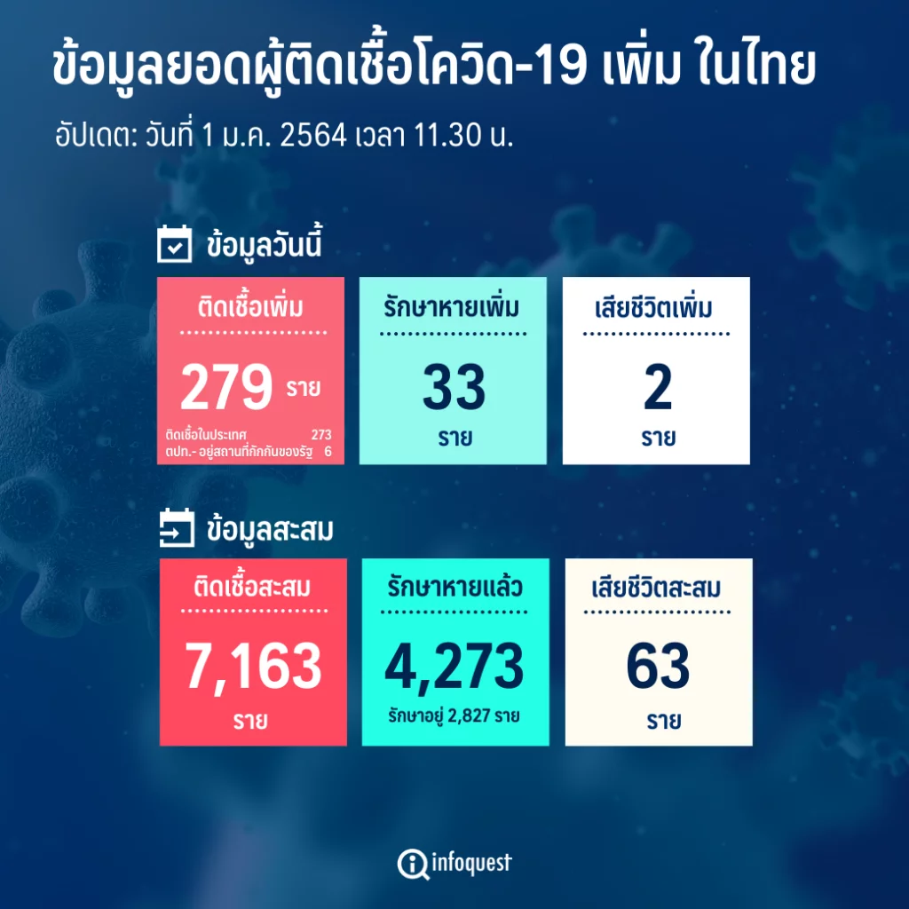ศบค.สรุปยอดผู้ติดเชื้อโควิด-19 ในไทย วันนี้ (11.30 น.) ผู้ติดเชื้อสะสม 7,163 คน (+279) เป็นผู้ติดเชื้อในประเทศ = 273 ราย เป็นผู้ติดเชื้อจากต่างประเทศอยู่ในสถานกักกันที่รัฐจัดให้ (State Quarantine) =…