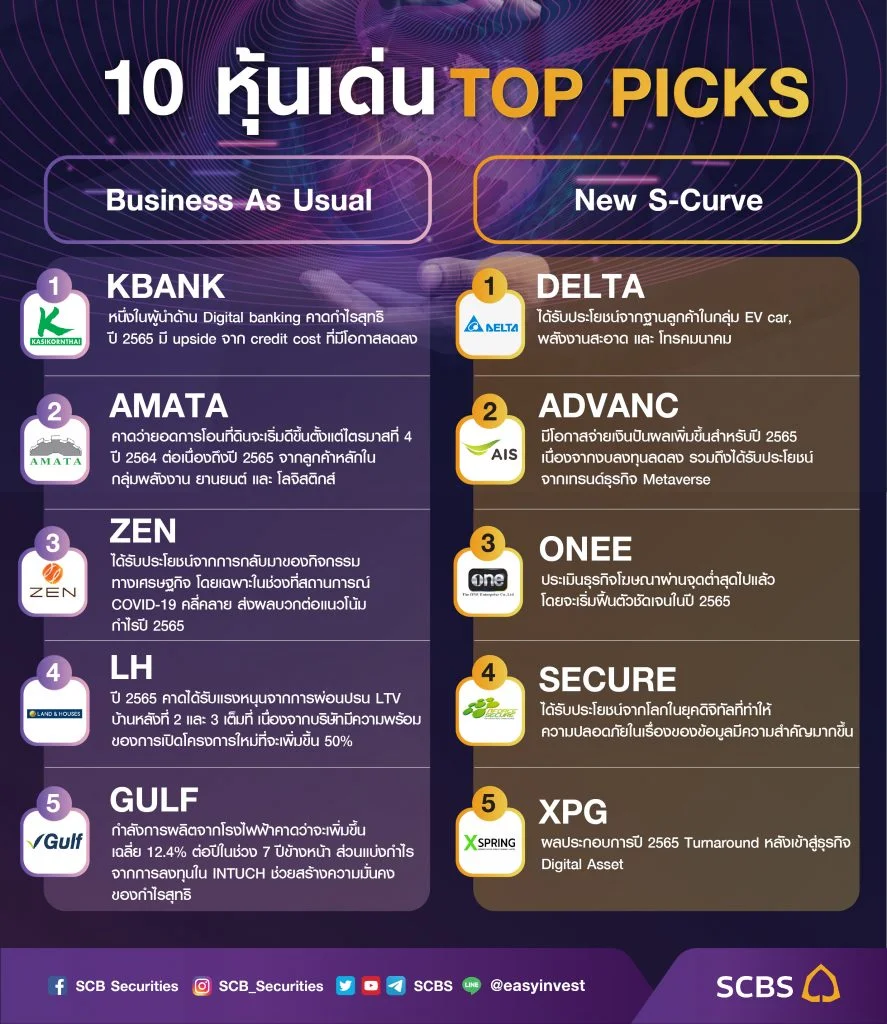 โดยกลุ่มอุตสาหกรรมที่โดดเด่นในปี 65 มีการฟื้นตัวของเศรษฐกิจและเทรนด์โลกสนับสนุน คือ กลุ่มพาณิชย์ กลุ่มสื่อสาร กลุ่มประกัน กลุ่มยานยนต์ และกลุ่มธนาคาร