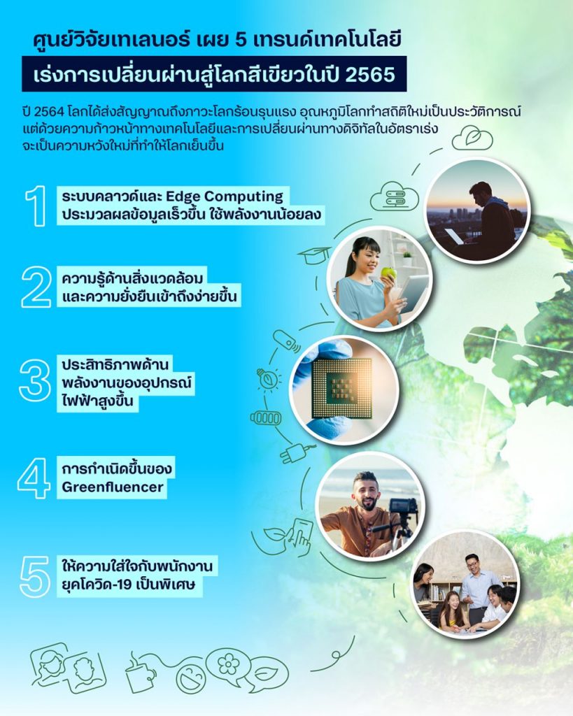 ศูนย์วิจัยเทเลนอร์คาดการณ์ 5 ความก้าวหน้าสำคัญทางเทคโนโลยีของโลก ได้แก่ การประมวลผลข้อมูลแบบ Edge บนเครือข่าย 5G, นวัตกรรมด้านพลังงาน, ความรู้ด้านสิ่งแวดล้อมที่เข้าถึงง่ายขึ้น, Greenfluener และความเหลื่อมล้ำจากคนรุ่นโควิด-19 ท่ามกลางเมกะเทรนด์สำคัญอย่างการเปลี่ยนผ่านสู่โลกสีเขียว หลังผู้เชี่ยวชาญชี้สภาวะโลกร้อนยังเลวร้ายได้อีก