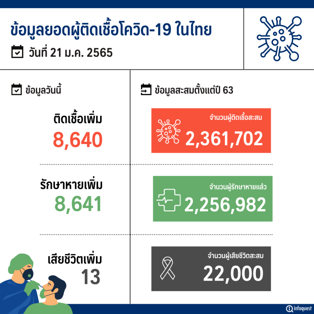 สำหรับจำนวนผู้ป่วยยืนยันสะสมในประเทศตั้งแต่ต้นปี 63 จนถึงล่าสุดอยู่ที่ 2,361,702 ราย โดยมีผู้ป่วยรักษาหายแล้วเพิ่มขึ้น 8,641 ราย ยอดเสียชีวิตสะสมเพิ่มเป็น 22,000 ราย