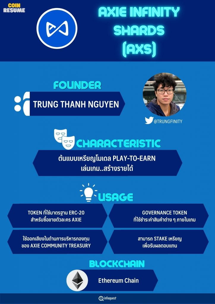 | Usage | Token ที่ใช้มาตรฐาน ERC-20 สำหรับซื้อขายตัวละคร Axie ในระบบ Ecosystem ของ Axie Infinity |