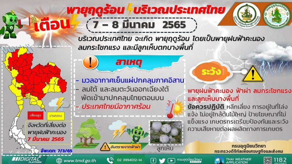 กรมอุตุนิยมวิทยา ออกประกาศเตือนภัยพายุฤดูร้อนบริเวณประเทศไทย ซึ่งจะมีผลกระทบไปถึงวันที่ 8 มี.ค.65 เนื่องจากบริเวณประเทศไทยตอนบนจะมีพายุฤดูร้อนเกิดขึ้น โดยมีลักษณะของพายุฝนฟ้าคะนอง ลมกระโชกแรง และมีลูกเห็บตกบางพื้นที่ รวมถึงมีฟ้าผ่าที่จะเกิดขึ้น เนื่องจากบริเวณความกดอากาศสูงหรือมวลอากาศเย็นกำลังปานกลางจากประเทศจีน ได้แผ่ลงมาปกคลุมประเทศไทยตอนบน ในขณะที่บริเวณประเทศไทยตอนบนมีอากาศร้อน