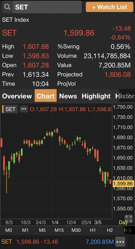 เมื่อเวลา 10.04 น.ดัชนี SET อยู่ที่ 1,599.86 จุด ลดลง 13.48 จุด (-0.84%)