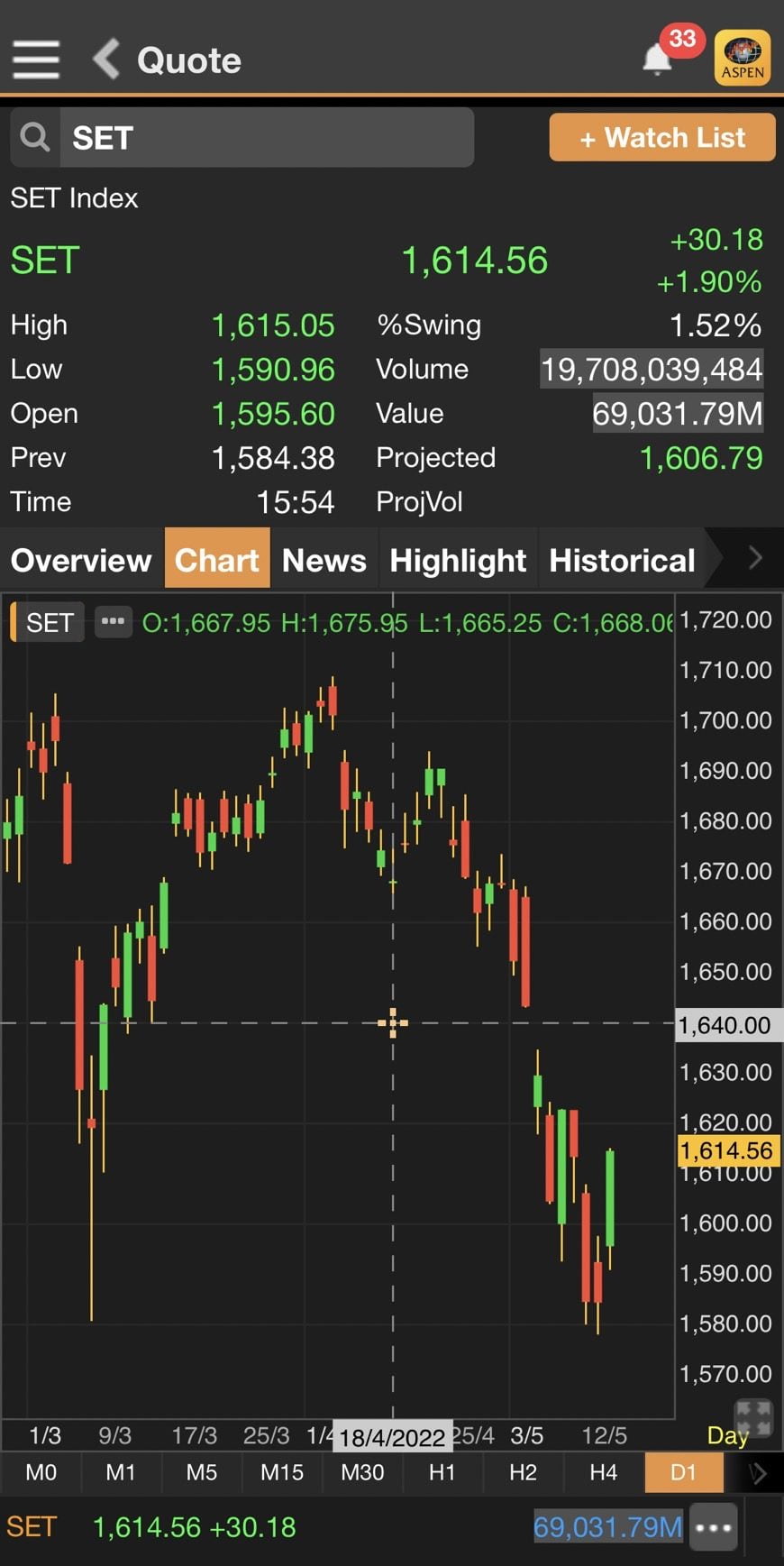- เมื่อเวลา 15.54 น. ดัชนี SET มาอยู่ที่ 1,614.56 จุด เพิมขึ้น 30.18 จุด (+1.90%)