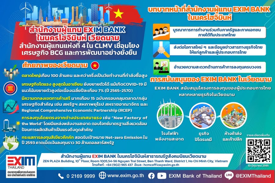 โอกาสนี้ EXIM BANK จึงพร้อมเปิดดำเนินงานสำนักงานผู้แทนในนครโฮจิมินห์อย่างเป็นทางการ เพื่อทำงานร่วมกับภาครัฐและภาคเอกชนภายใต้ทีมประเทศไทย และเป็นส่วนหนึ่งของการเสริมทีม EXIM BANK สู่บทบาท “ธนาคารเพื่อการพัฒนาแห่งประเทศไทย” ควบคู่กับการเป็น “ศูนย์บริการครบวงจรเพื่ออำนวยความสะดวกทางการค้าระหว่างประเทศให้แก่ SMEs” ด้วยภารกิจ “ซ่อม สร้าง เสริม และสานพลัง” เพื่อเป็นกลไกการพัฒนาร่วมกันระหว่างประเทศไทยและภูมิภาคอาเซียนอย่างยั่งยืน ท่ามกลางความท้าทายและการเปลี่ยนแปลงที่เกิดขึ้นตลอดเวลาของโลกยุค Next Normal