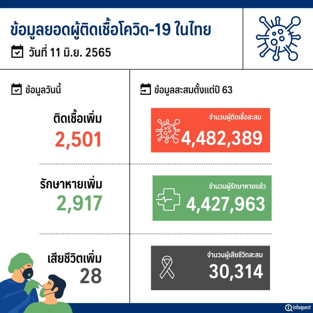 สำหรับจำนวนผู้ป่วยยืนยันสะสมในประเทศตั้งแต่ต้นปี 63 จนถึงล่าสุดอยู่ที่ 4,482,389 ราย โดยมีผู้ป่วยรักษาหายแล้วเพิ่มขึ้น 2,917 ราย ยอดเสียชีวิตสะสมเพิ่มเป็น 30,314 ราย