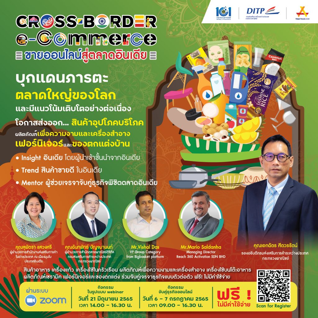 กรมส่งเสริมการค้าระหว่างประเทศ กระทรวงพาณิชย์ จัดกิจกรรม “Cross-Border e-Commerce ขายออนไลน์สู่ตลาดอินเดีย” ชวนเจาะลึกโมเดลธุรกิจแบบ Exclusive เพื่อต่อยอดการทำตลาดออนไลน์ให้ยอดขายปังกับการส่งออกสู่ประเทศอินเดีย ตลาดใหญ่ของโลก และมีแนวโน้มเติบโตอย่างต่อเนื่อง โดย ทูตพาณิชย์ และ ผู้นำเข้าอินเดีย ภายใต้กิจกรรม Webinar ต่อเนื่องด้วย Online Business Matching ผลักดันผู้ประกอบการไทยเจาะตลาดออนไลน์แดนภารตะ
