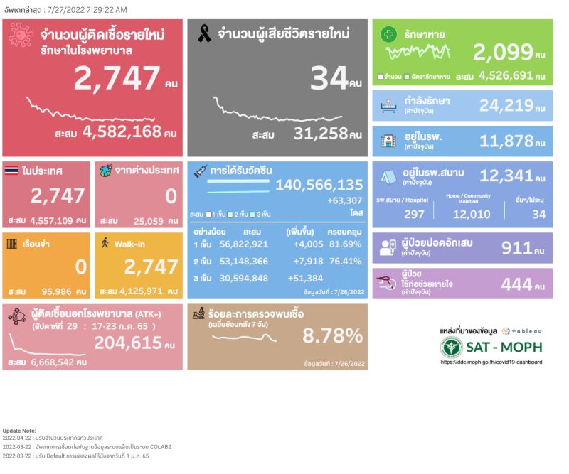 สำหรับจำนวนผู้ป่วยยืนยันสะสมในประเทศตั้งแต่ต้นปี 63 จนถึงล่าสุดอยู่ที่ 4,582,168 ราย โดยมีผู้ป่วยรักษาหายแล้วเพิ่มขึ้น 2,099 ราย ยอดเสียชีวิตสะสมเพิ่มเป็น 31,258 ราย