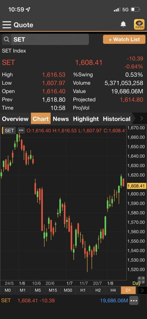 - ล่าสุด เมื่อเวลา 11.15 น. ดัชนี SET มาอยู่ที่ 1,608.25 จุด ลดลง 10.55 จุด (-0.65%)